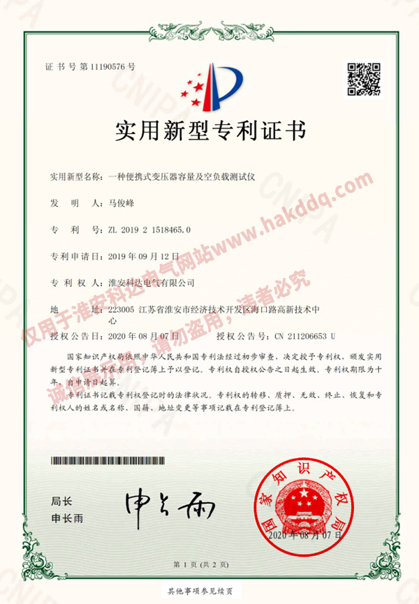 便攜式變壓器容量及空負載測試儀專(zhuān)利證書(shū)