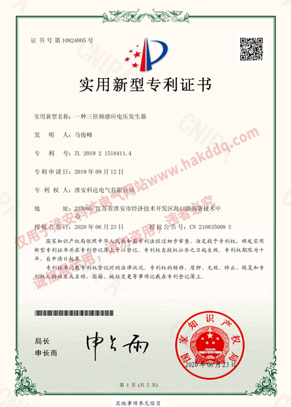 三倍頻感應電壓發(fā)生器專(zhuān)利證書(shū)